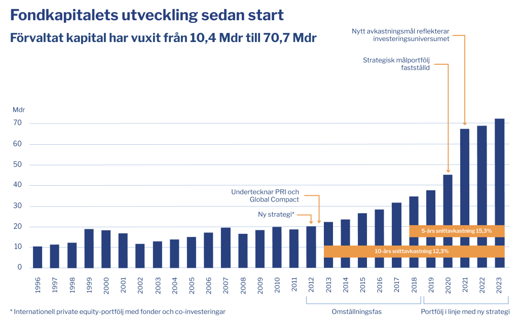 Långsiktigheten illustreras av att en enskild fondutfästelse sträcker sig över 10–15 år och en enskild co-investering har en innehavstid om 3–8 år. En viktig del i strategin är kombinationen av högkvalitativa fondutfästelser och co-investeringar där hållbarhet är fullt integrerat genom hela investeringsprocessen och ägandefasen.